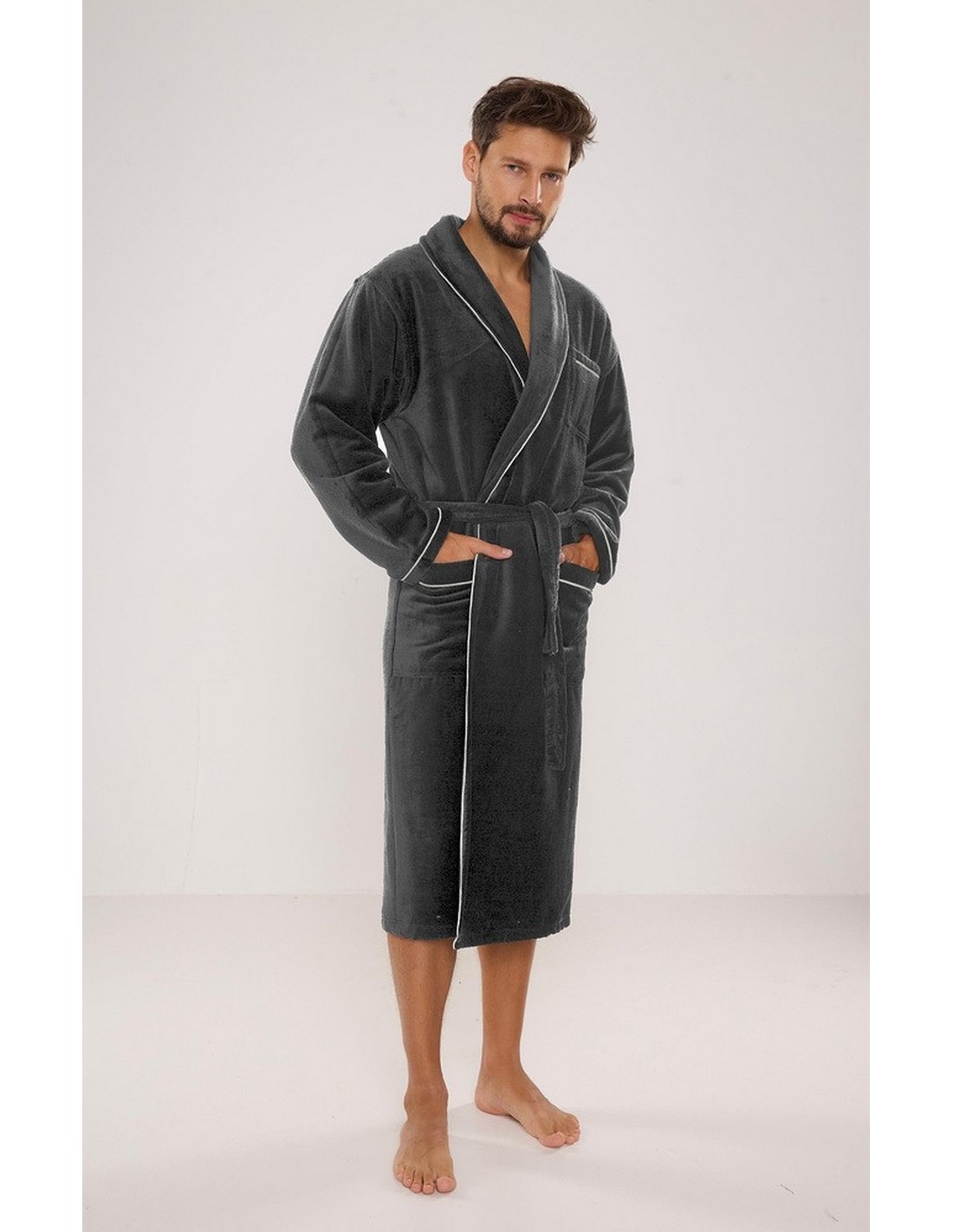 Szlafrok męski De Lafense 735 Manuele to elegancki model wykonany z miękkiego materiału. Idealny dla mężczyzn, którzy cenią sobie komfort i styl. Długi krój oraz wiązanie w pasie zapewniają wygodę i swobodę noszenia.
