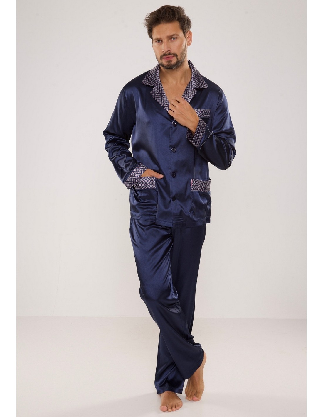 Niezwykle elegancka męska piżama wykonana w wysokiej klasy gładkiego i błyszczącego satynowego materiału. Góra w formie koszuli jest zapinana na guziki, ma długie rękawy oraz kołnierz wykończone ozdobnym drukowanym materiałem.
