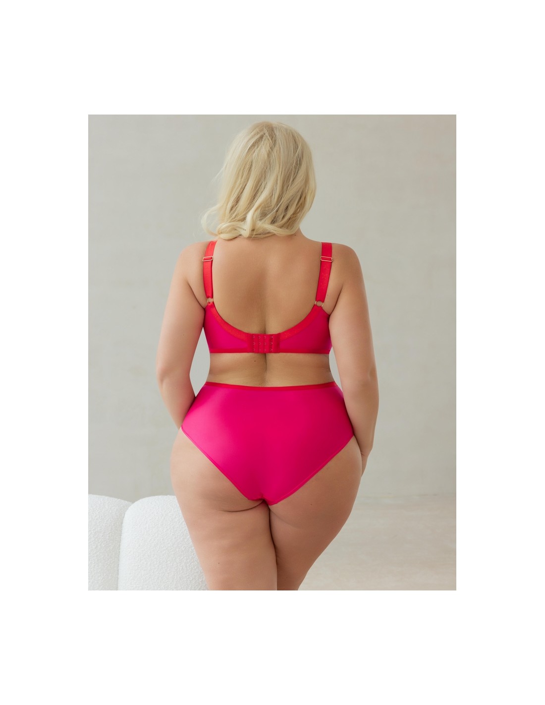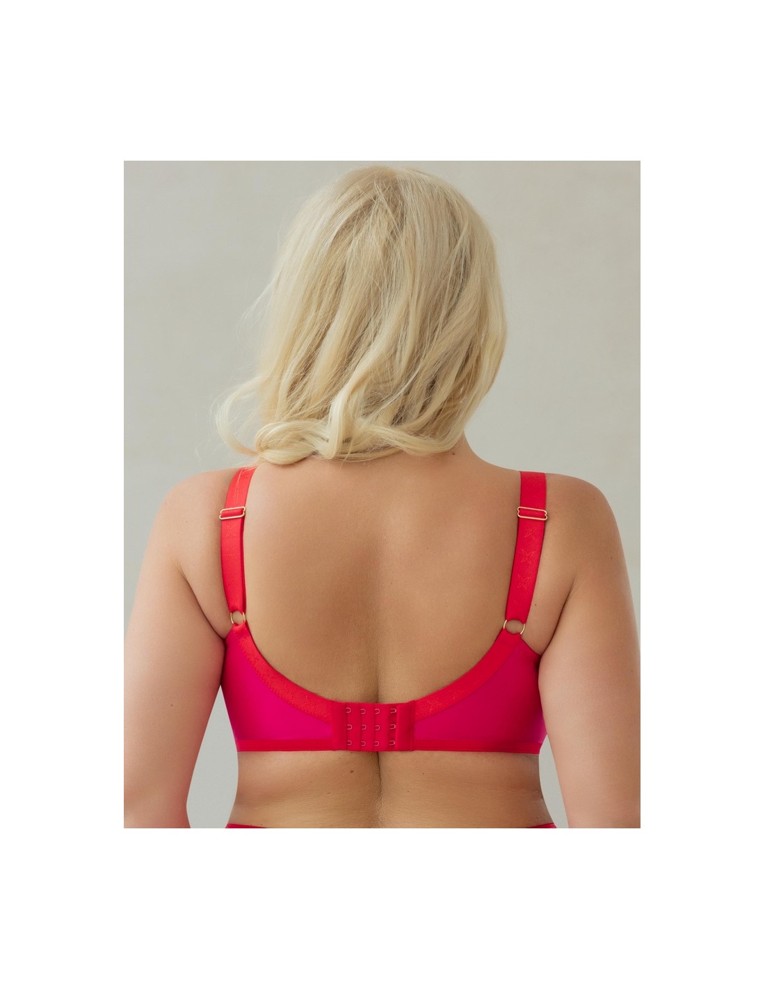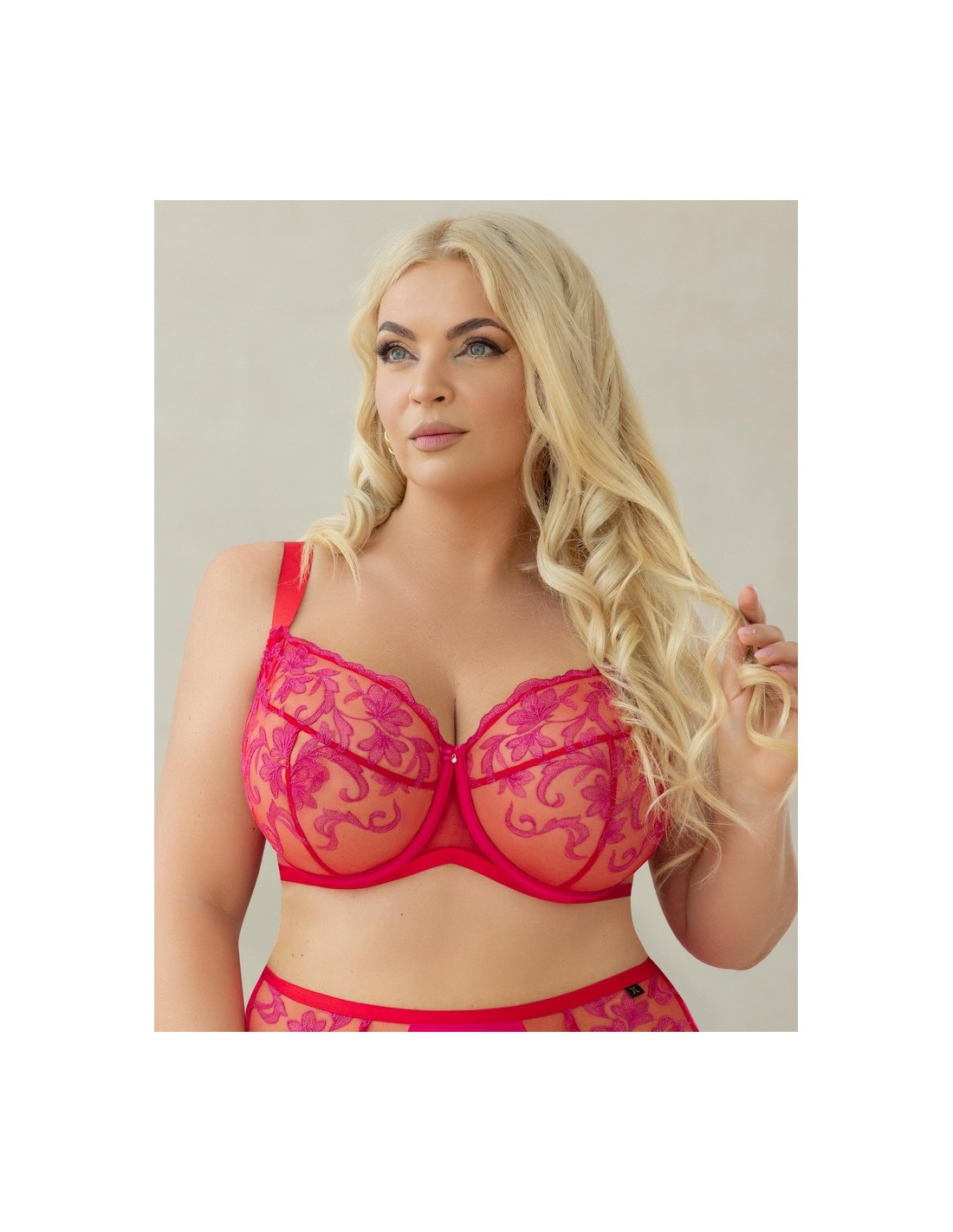 Ten czerwono różowy stanik koronkowy Krisline Juicy wyróżnia się zabudowanymi miseczkami, które obejmują całe piersi. Dolna część miski jest cięta na trzy części, co zapewnia dodatkowe wsparcie i zbiera biust z boków, maskując niedoskonałości w rejonie pachy. Regulowane ramiączka oraz fiszbiny gwarantują wygodę noszenia i doskonałe dopasowanie. Model idealnie sprawdzi się na co dzień oraz na specjalne okazje, oferując stuprocentowe poczucie komfortu dla dużych biustów. Wykonany z miękkiego materiału, biustonosz zapewnia elastyczność i oddychalność.