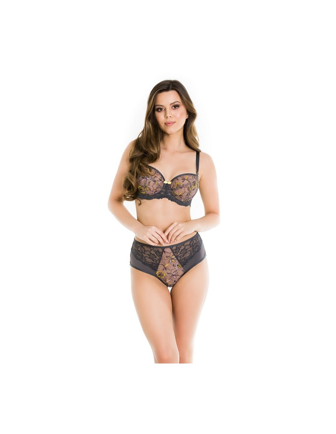 Biustonosz koronkowy Sunflower Mediolano 19164 to doskonały wybór dla kobiet z średnim i dużym biustem. Miękkie miseczki z beżowej siatki zdobione są wzorem kwiatowym na grafitowym tle, co nadaje mu elegancki charakter. Regulowane ramiączka oraz boczki z mikrofibry wzmacniane fiszbiną zapewniają odpowiednie podtrzymanie i komfort na co dzień. Biustonosz sprawdzi się doskonale zarówno w codziennych stylizacjach, jak i na specjalne okazje. Dodatkowym atutem jest urocza żółta kokardka oraz koronkowe detale, które dodają mu subtelności.