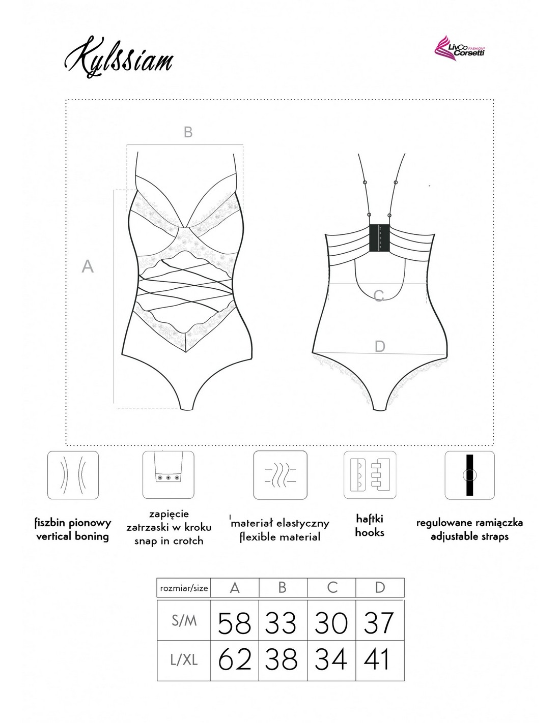 Zmysłowe body Kylssiam to idealna propozycja na wyjątkowy wieczór. Sprawią, że każda dziewczyna poczuje się w nich niezwykle atrakcyjnie i kusząco.Elegancja i seksapil. Bielizna wieczorowa Kylssiam to połączenie dyskretnej elegancji i odważnej zmysłowości. Body wykonane zostało z prześwitującego materiału w klasycznym, czarnym kolorze. Miseczki biustonosza oraz dolna część bielizny to delikatna, tiulowa siateczka o drobnych oczkach. Elastyczna dzianina dopasowuje się do sylwetki. Bielizna została udekorowana subtelną koronką z roślinnymi ornamentami na biuście, brzuchu, nogach oraz pośladkach. Cienkie ramiączka mają możliwość regulacji długości. Na miseczkach biustonosza oraz na obu bokach body umieszczono seksowne przeszycia. Na brzuchu znajduje się odważne wycięcie w kształcie rombu, śmiało odsłaniające pępek. Również ten obszar, jak i biust zostały ozdobione delikatnymi paseczkami, podobnie jak głęboko wycięty dekolt na plecach. Bielizna wieczorowa Kylssiam zmysłowo eksponuje brzuch oraz biust. Dostępna jest w dwóch rozmiarach S/M oraz L/XL.