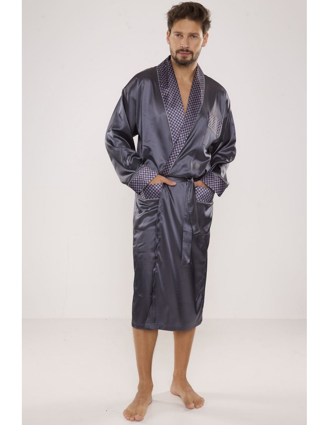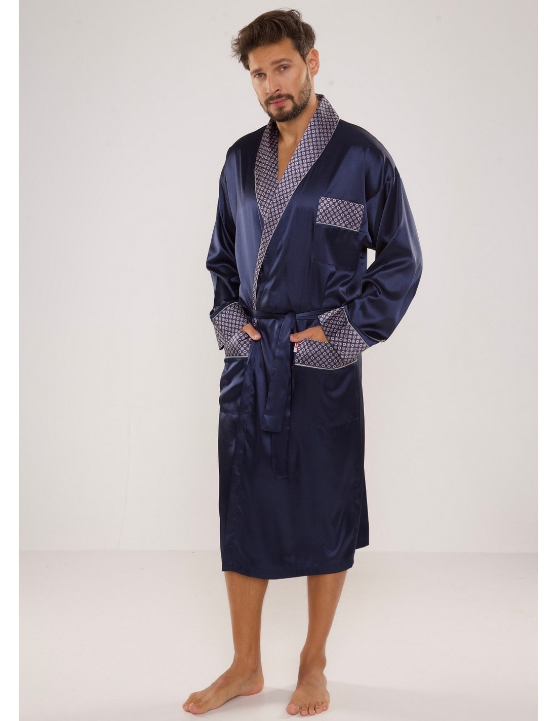 Extremely exclusive long robe for men made of shiny satin pleasant to the touch. This model has long sleeves, a collar and pockets finished with a decorative pattern material. The bathrobe is tied at the waist, which gives a sense of freedom.