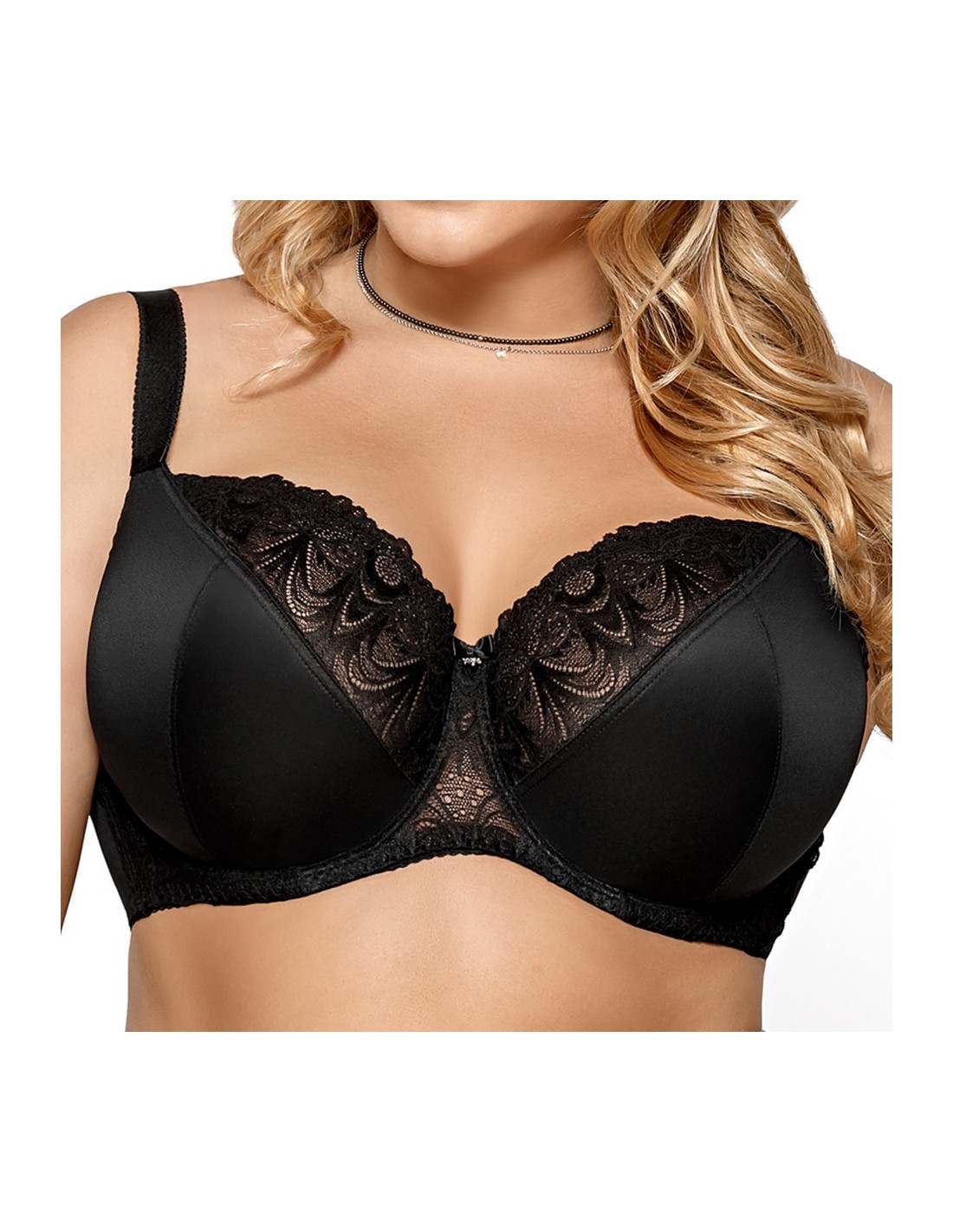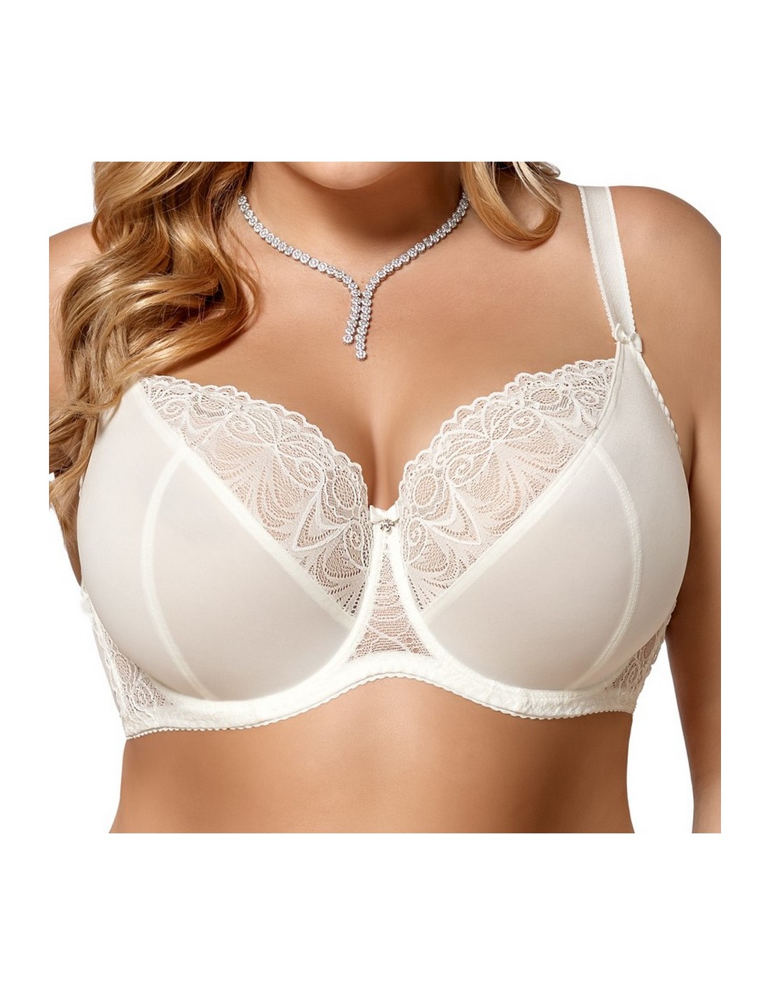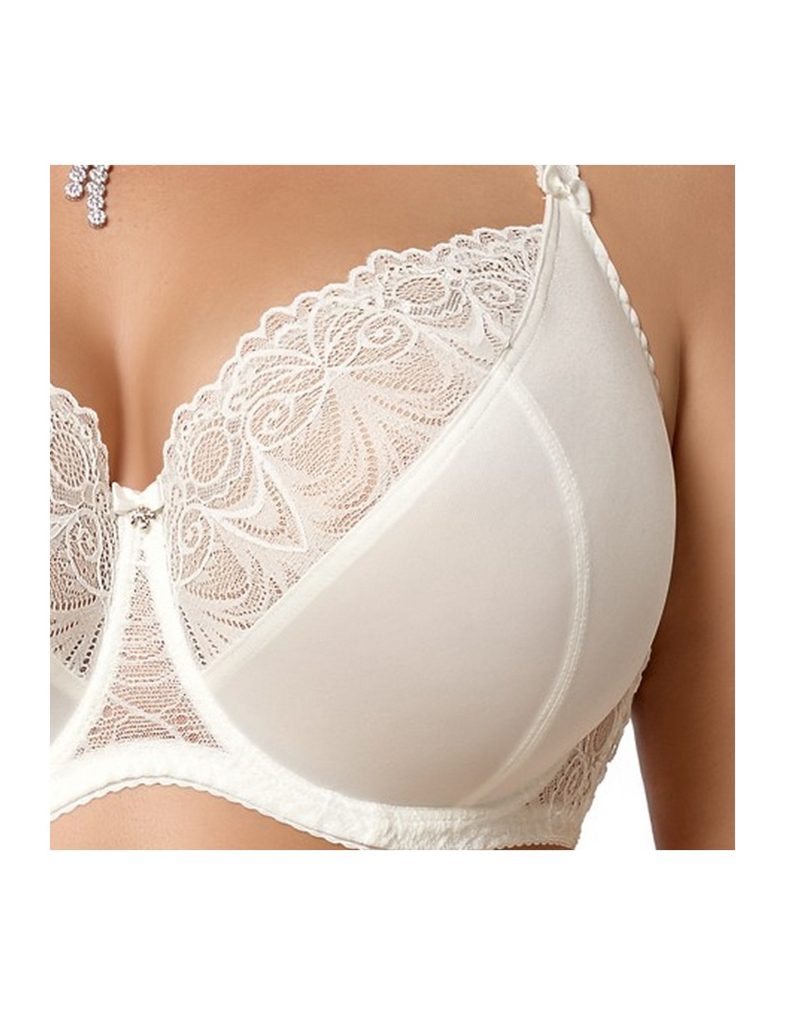 K425 Casablanca bra is a well-cut soft bra available in a wide range of colors. Underwired cups with a three-part design gather the bust well and keep it in place. The lower part of the cups is made of a smooth and strong fabric. The upper part of the cups, the bridge and the sides are made of beautiful lace, lined with a delicate mesh for reinforcement. In the middle there is a small bow with a jewelery ornament. The bra ensures that the breasts are perfectly gathered inwards, raised and have a nicely rounded shape. Wide sides made of lace lined with mesh, additionally equipped with vertical underwires, keep the bra in the right place. The back is made of a strong Lycra knit. Adjustable, non-removable shoulder straps, of various widths depending on the size. Clasp: 3-row, two- and three-row hooks depending on the size.