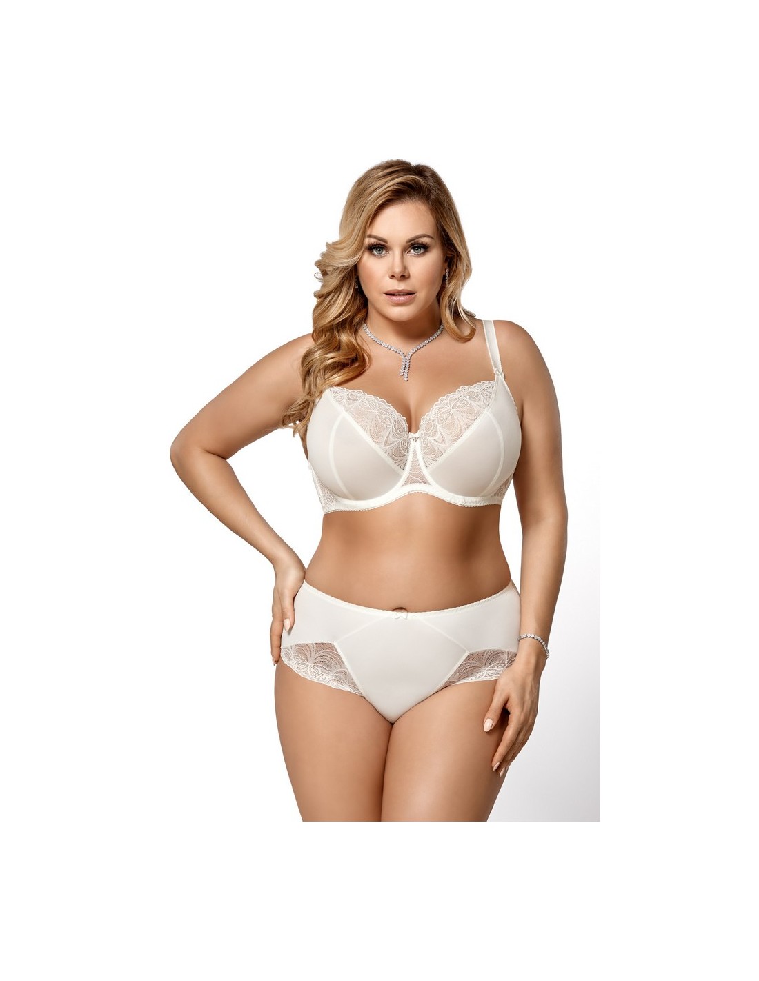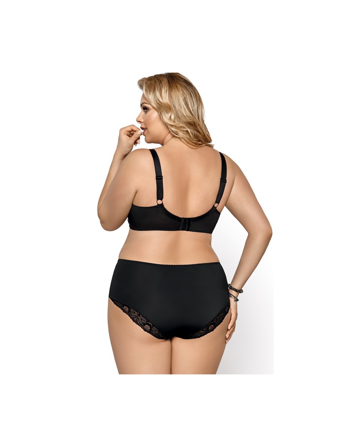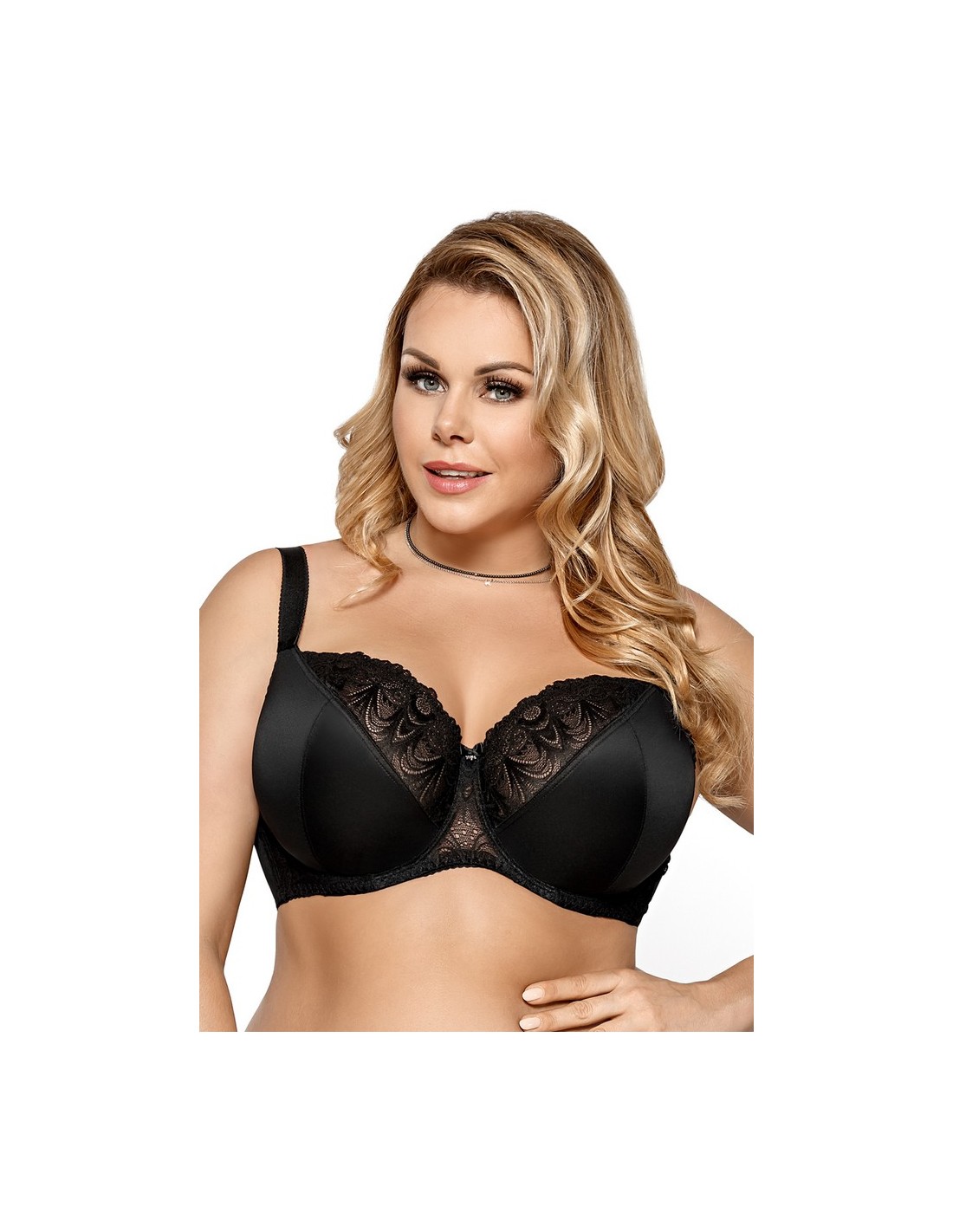 K425 Casablanca bra is a well-cut soft bra available in a wide range of colors. Underwired cups with a three-part design gather the bust well and keep it in place. The lower part of the cups is made of a smooth and strong fabric. The upper part of the cups, the bridge and the sides are made of beautiful lace, lined with a delicate mesh for reinforcement. In the middle there is a small bow with a jewelery ornament. The bra ensures that the breasts are perfectly gathered inwards, raised and have a nicely rounded shape. Wide sides made of lace lined with mesh, additionally equipped with vertical underwires, keep the bra in the right place. The back is made of a strong Lycra knit. Adjustable, non-removable shoulder straps, of various widths depending on the size. Clasp: 3-row, two- and three-row hooks depending on the size.