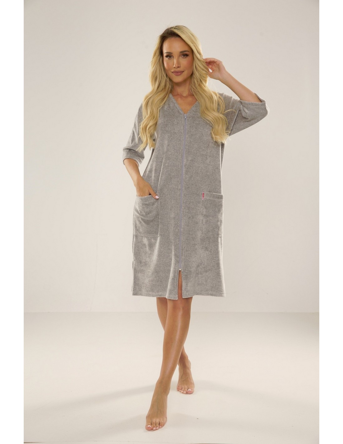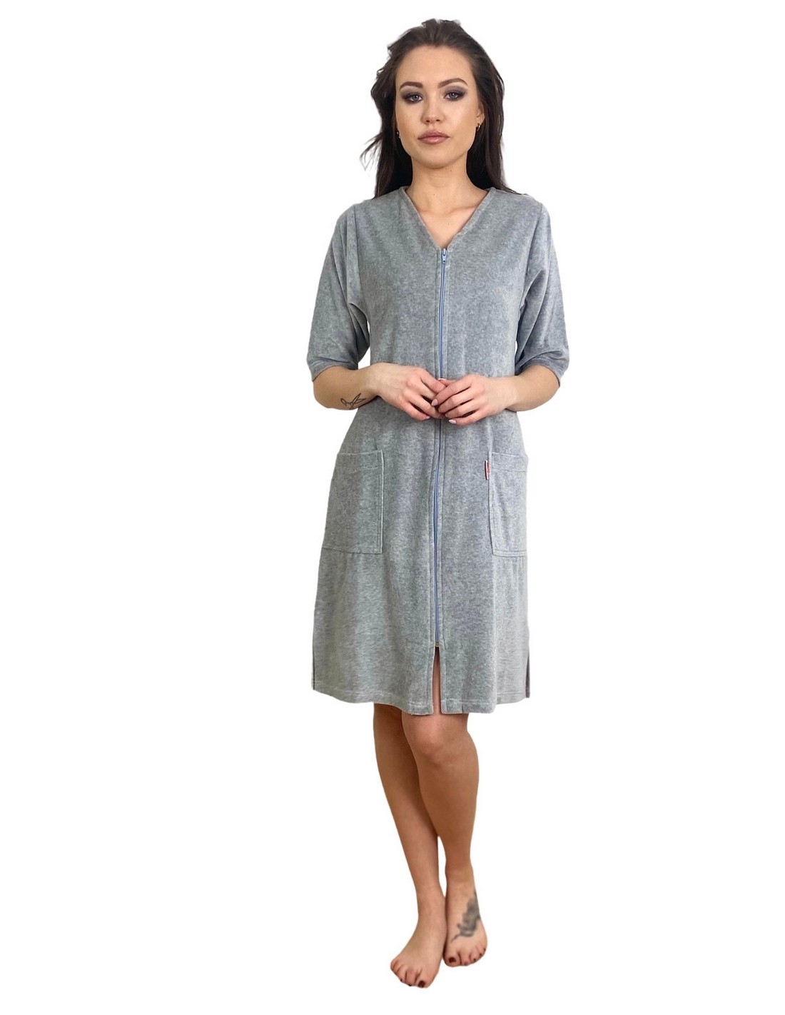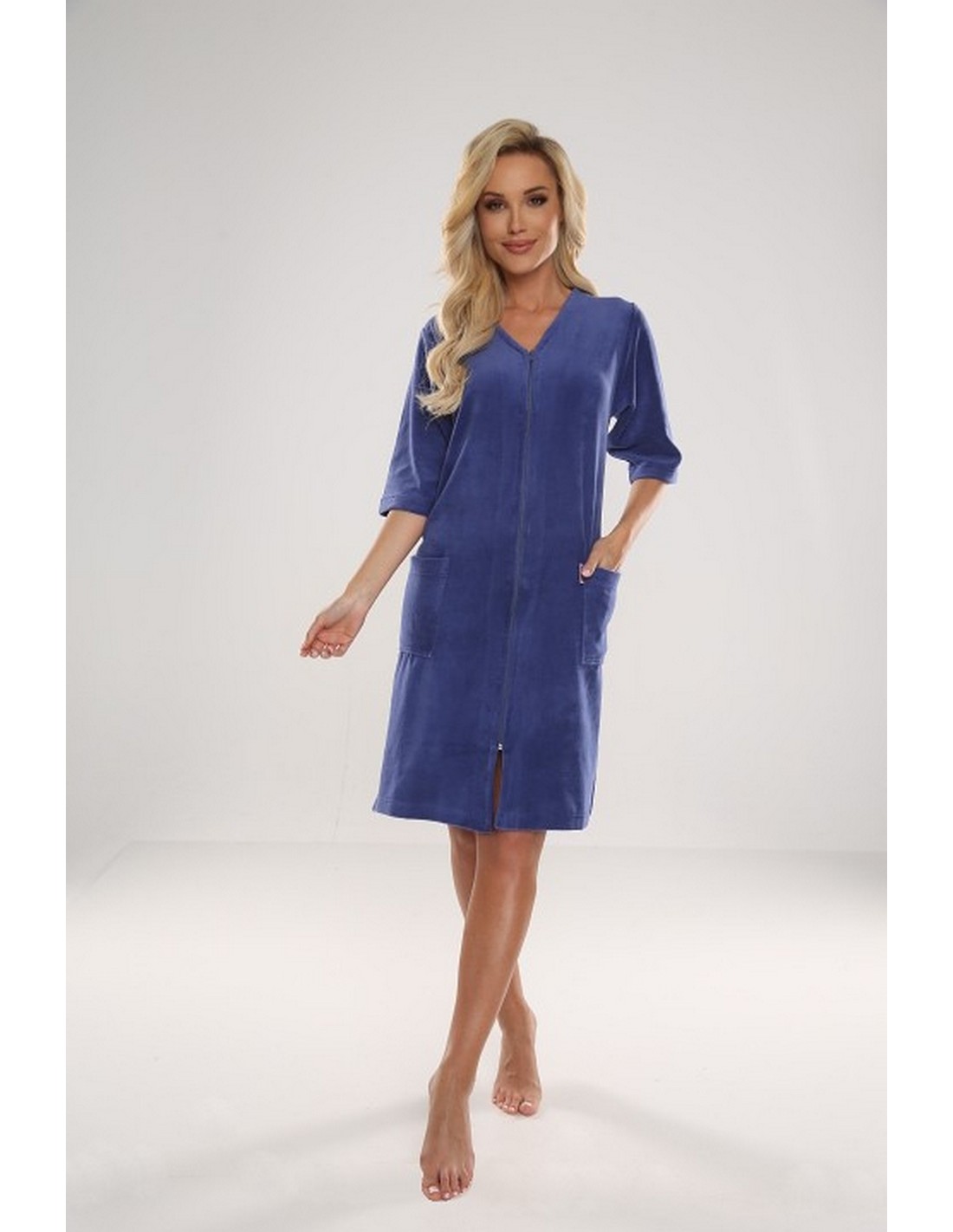 Velor short women's robe. The model has short sleeves and is zippered. The bathrobe has two large pockets with the De Lafense logo sewn on. 3/4 length sleeve.