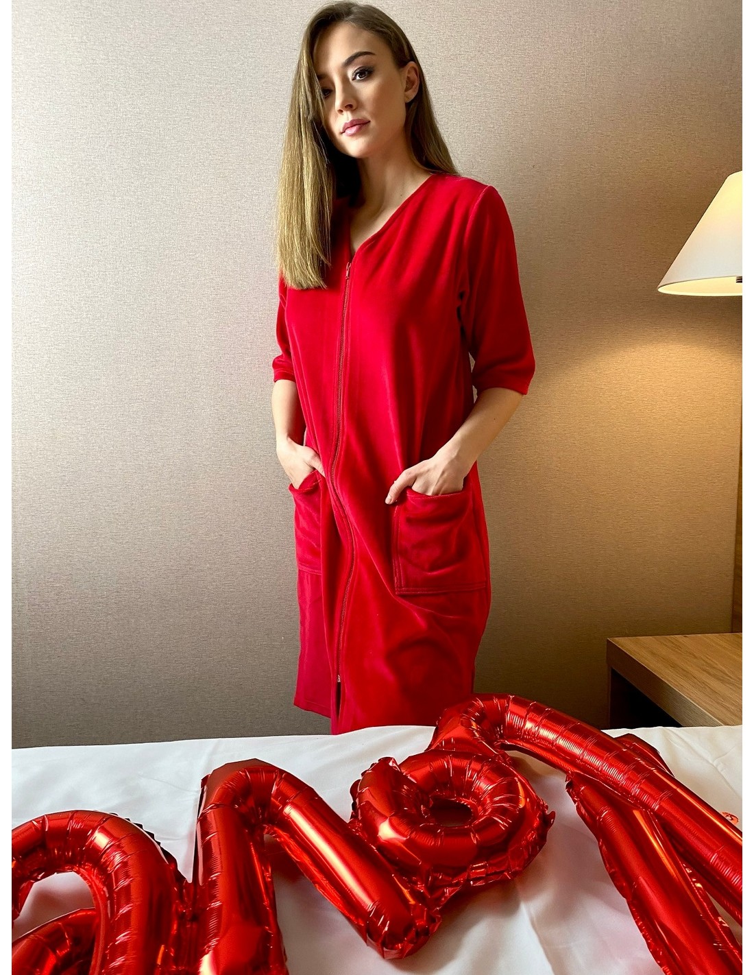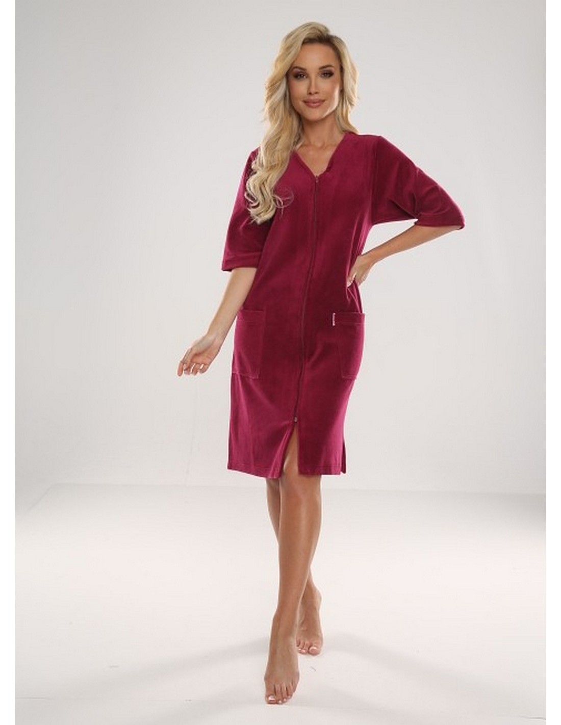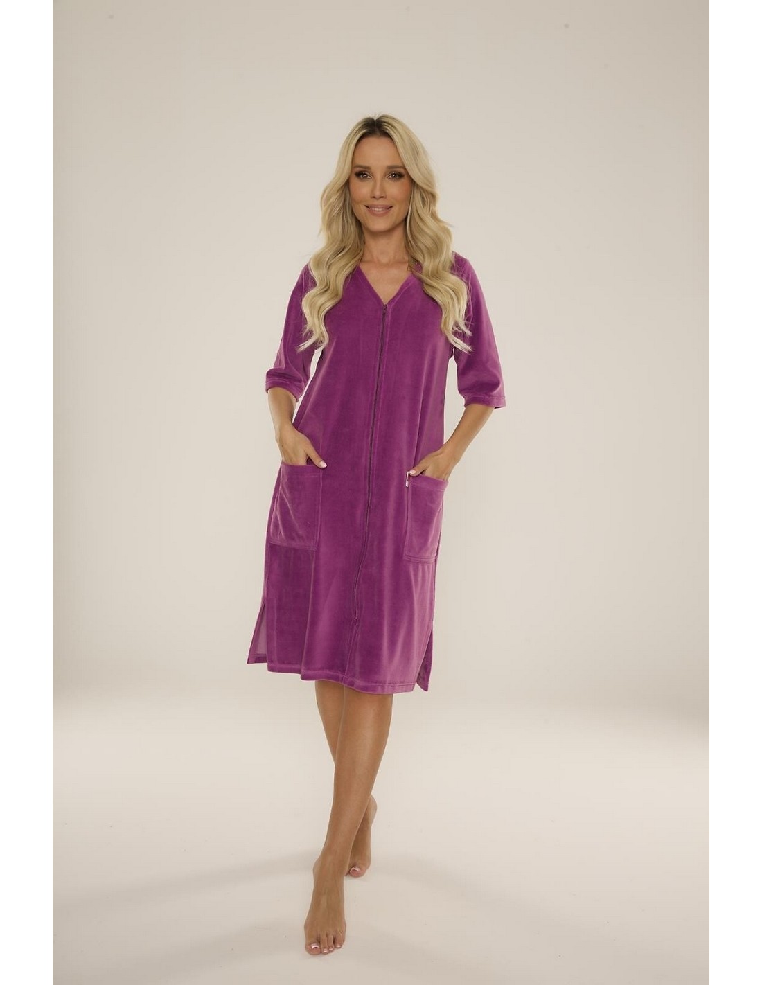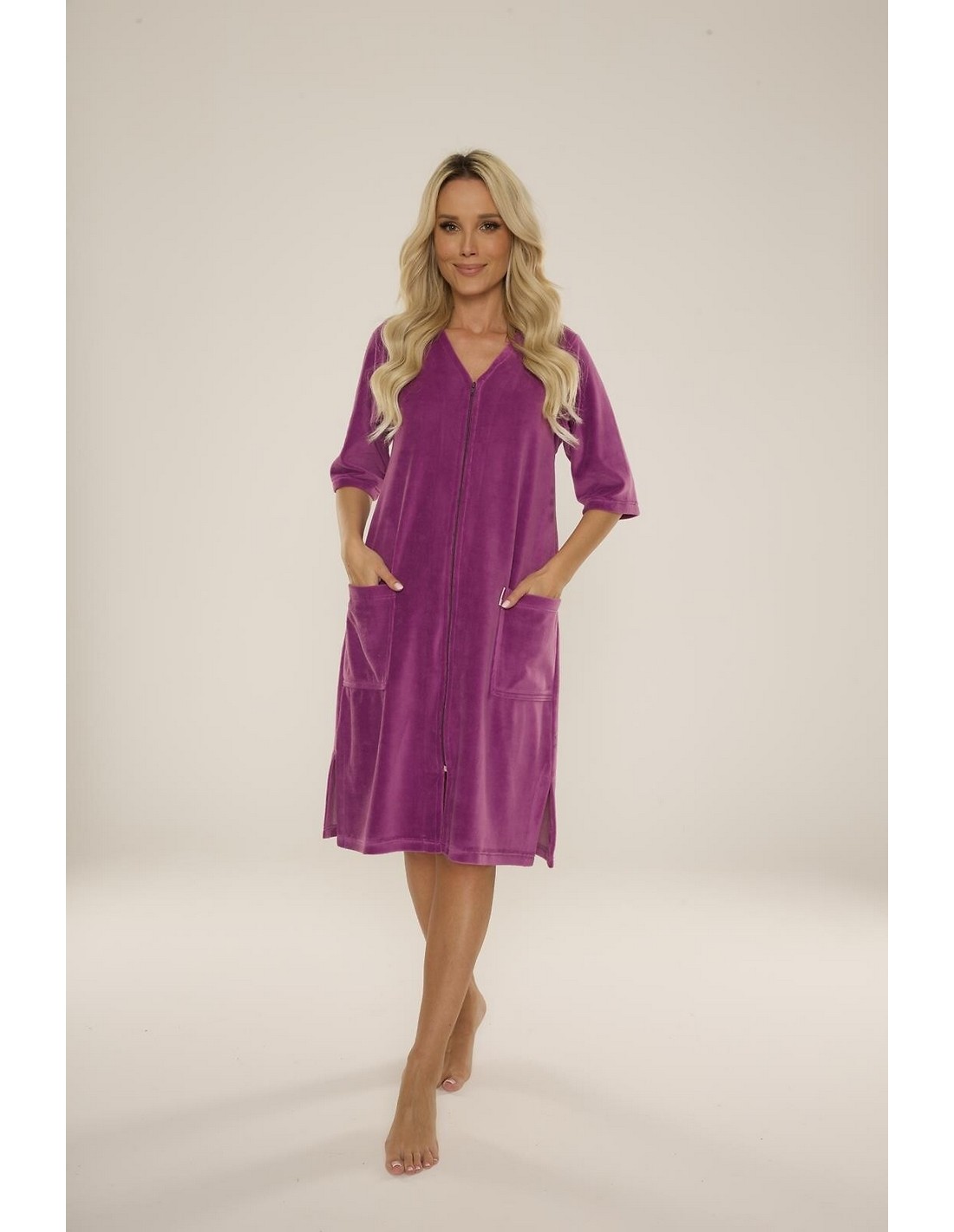 Velor short women's robe. The model has short sleeves and is zippered. The bathrobe has two large pockets with the De Lafense logo sewn on. 3/4 length sleeve.