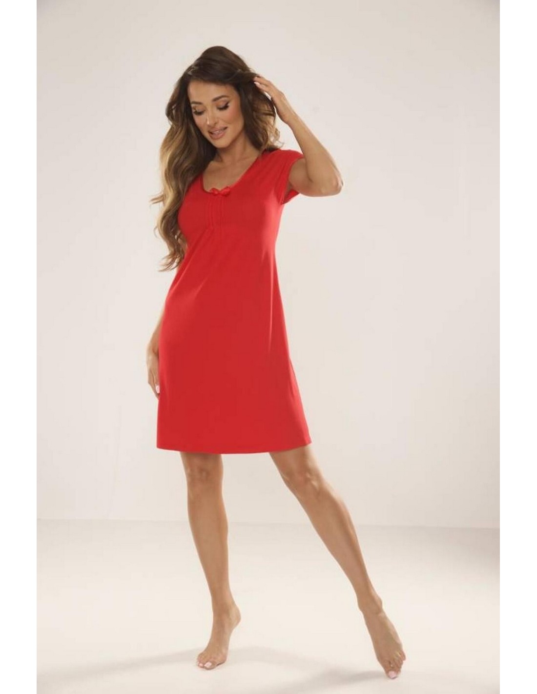 Comfortable nightgown with short sleeves, length above the knee. Made of flexible, pleasant viscose fabric, slightly wrinkled around the bust. The bridge is decorated with a charming bow. The T-shirt on the sleeves and around the neckline is finished with a narrow, shiny trim.