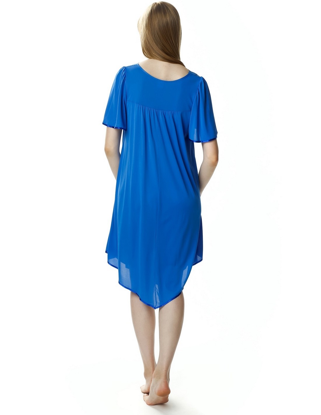 Loose women's shirt with short sleeves. The wide sleeves give the shoulders a slender look, and the strongly ruffled bottom with an asymmetrical cut will appeal to ladies with wider hips. The neckline is decorated with a delicate lace. Made of viscose knit. Packed in a box. Composition: 72% and polyamide 28%.