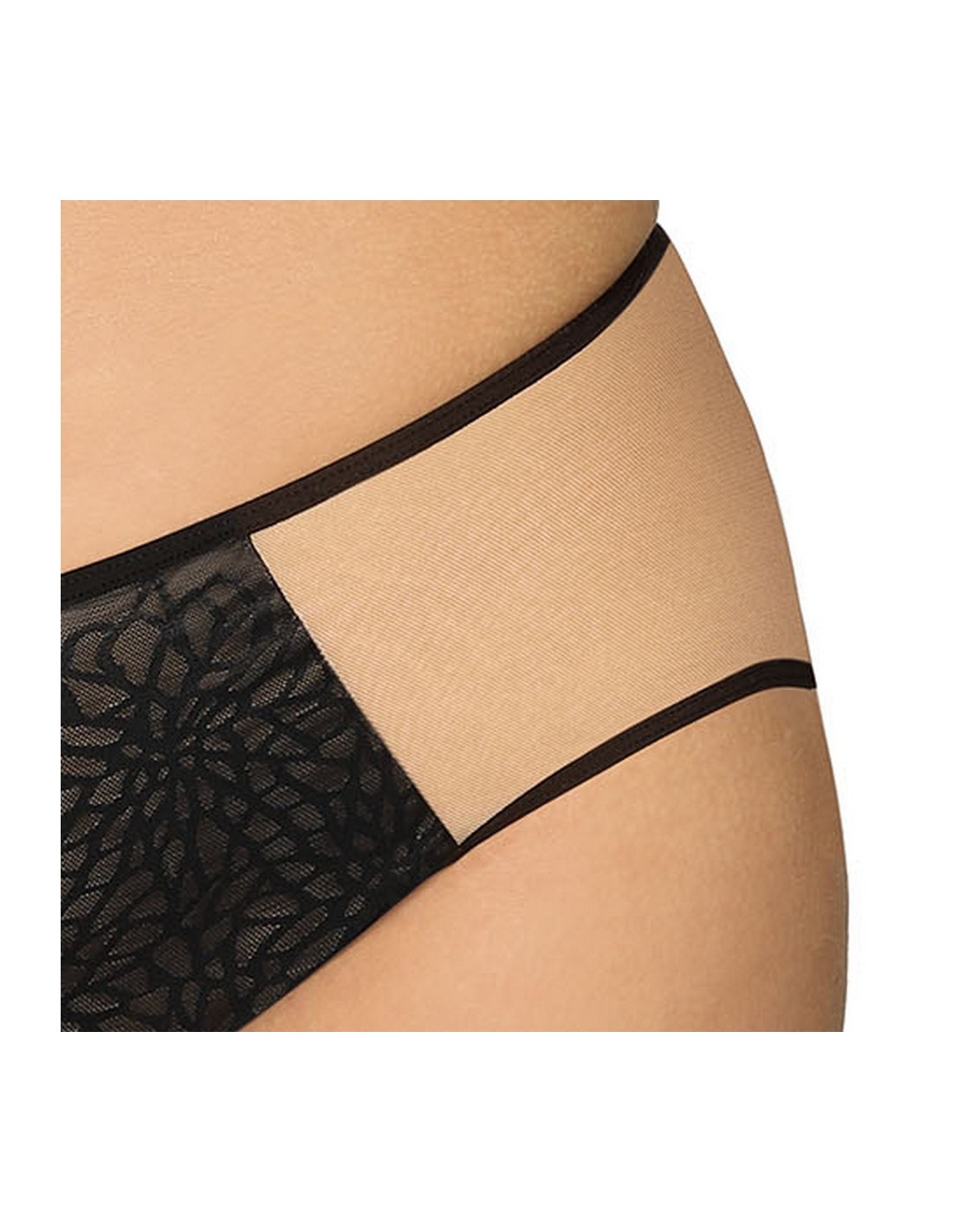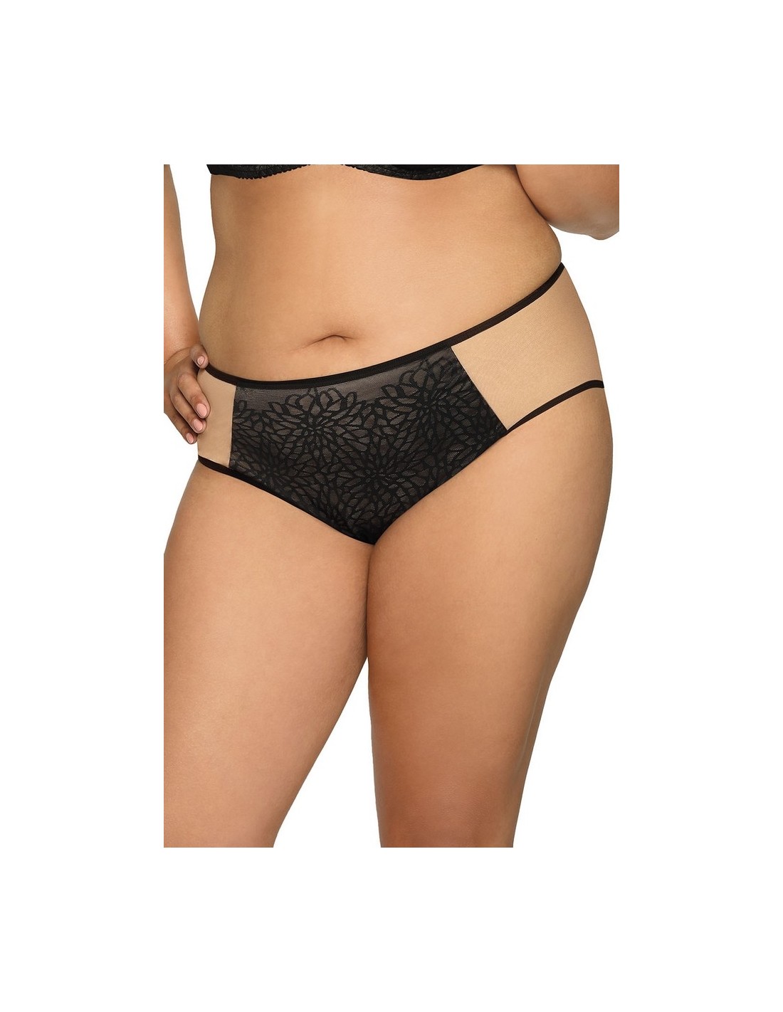 Przód wykonany z delikatnej koronki w odcieniu głębokiej czerni, natomiast tył z beżowej, gładkiej tkaniny, co zapewnia dyskrecję i komfort noszenia. Nogawki wykończone są podwójną siateczką, co dodaje subtelności. Skład materiału: 91% poliamid, 5% bawełna, 4% elastan, co gwarantuje elastyczność i trwałość.