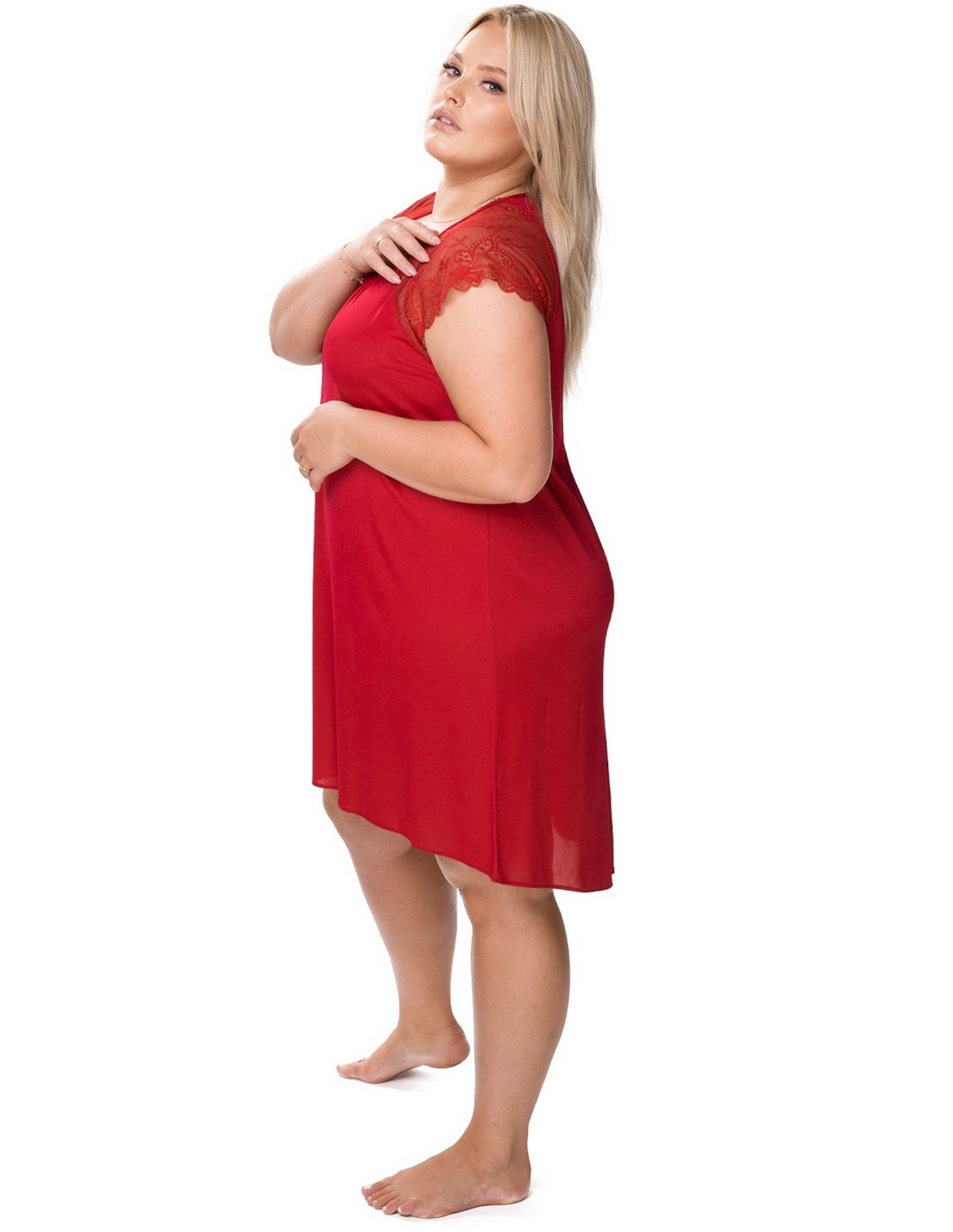 Koszula nocna posiada asymetryczny krój, z przodu jest krótsza - do kolan, a tył dłuższa. Okrągły dekolt oraz koronkowe rękawki nadają jej delikatnego romantycznego looku. Całość wygląda rewelacyjnie lekko i powabnie.