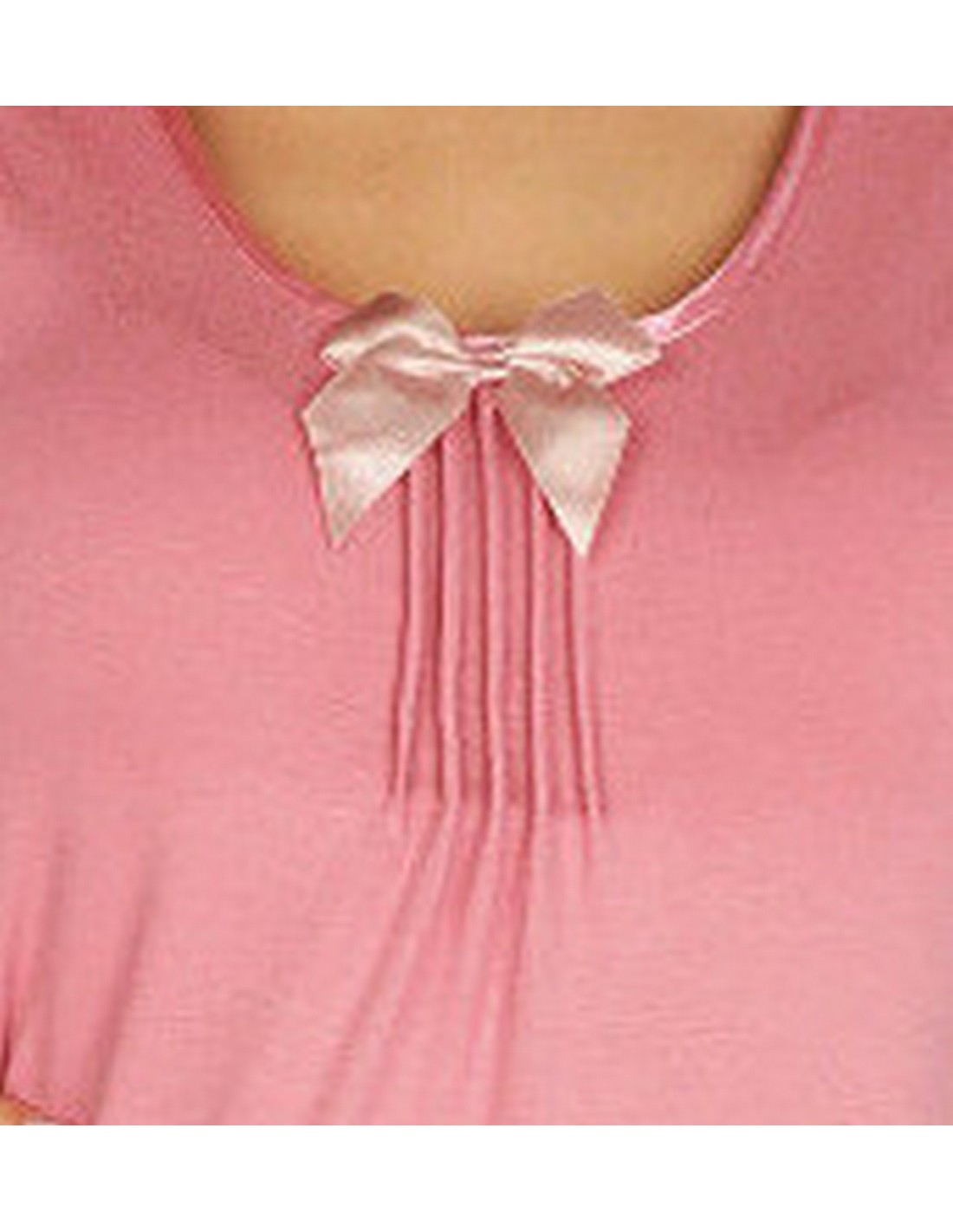 Niezwykła koszulka nocna na cienkich satynowych ramiączkach z regulacją. Subtelne zdobienia przy dekolcie wykończone delikatną kokardą. Górna część koszulki wykończona połyskującą lamówką. Bardzo wygodna, lekka i miła dla skóry została wykonana jest z wiskozowego materiału. Model dostępny w wielu ciekawych kolorach.