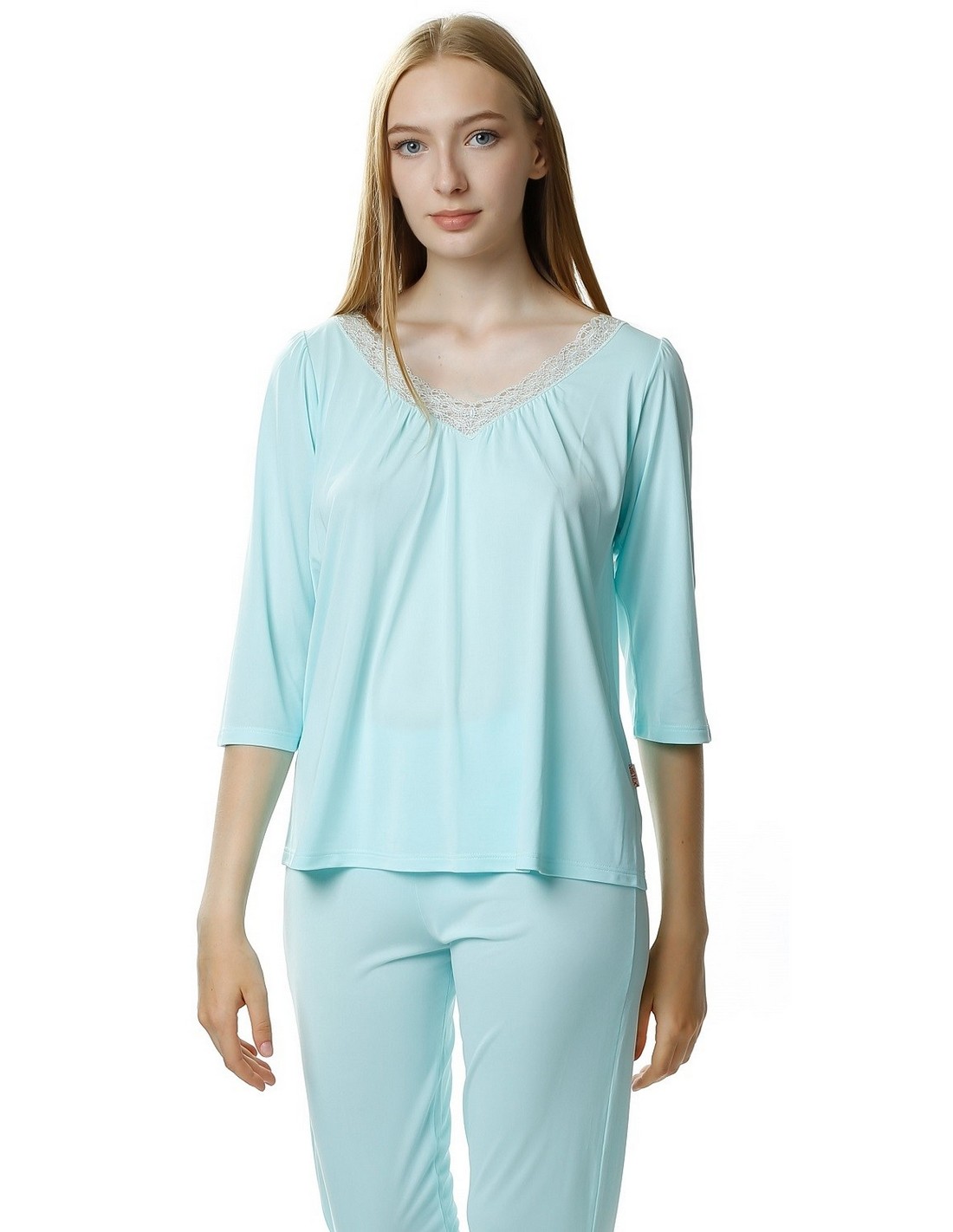 Dwuczęściowa piżama damska Vivien z jedwabiu wiskozowego wyróżnia się nieprzeciętnym wyglądem i prostym krojem. Ma bluzkę z rękawem o długości 3/4 i ozdobną koronkową wstążeczką na dekolcie oraz długie spodnie w klasycznym wykonaniu. Piżama jest bardzo wygodna. Materiał nie gniecie i nie przykleja się do ciała.