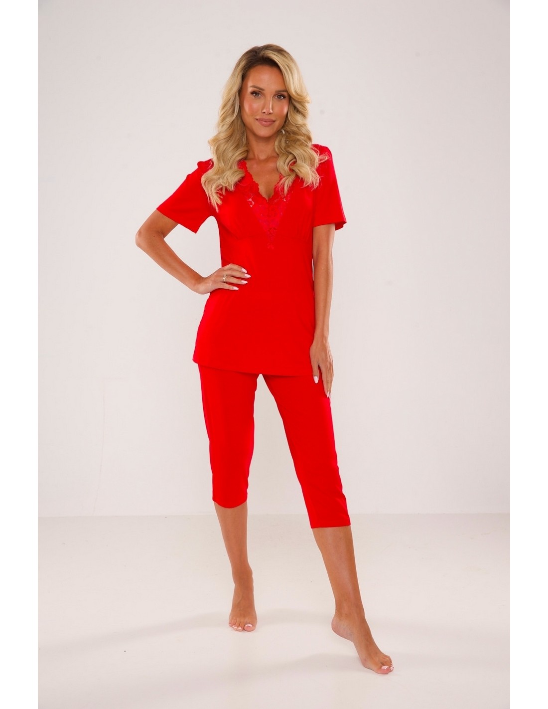 Piżama damska z krótkim rękawem, uszyta z wiskozy. Dekolt w serek wykończony koronką. Do kompletu spodnie rybaczki z kieszeniami.