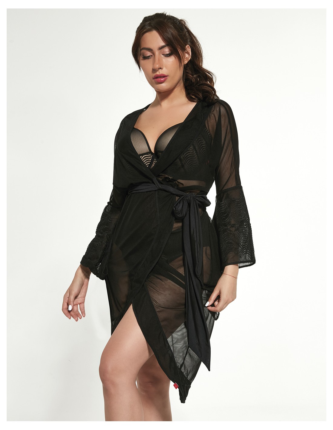 Rewelacyjny szlafrok wykonany jest z prześwitującej siateczki ładnie podkreśli damską sylwetkę. Model wiązany w pasie, rękawki wykończone wyjątkoweym haftem.